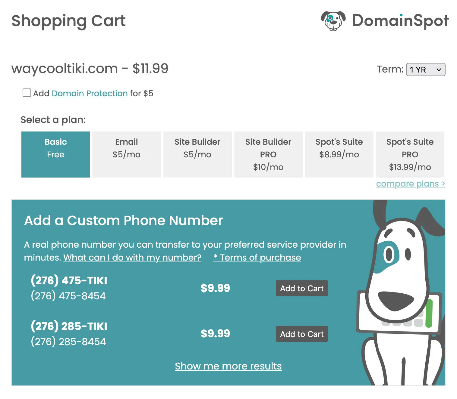 DomainSpot is an accredited domain registrar that simplifies getting your brand online through domains, websites and email. Using NumberBarn's API, DomainSpot shows available custom phone numbers to their customers in the shopping cart. The numbers shown are based on the domain(s) found in the customer's cart.