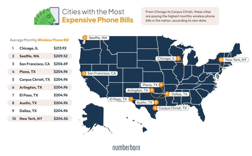 - In contrast, San Diego boasts the cheapest phone bills in the nation at $182.66 per month, saving residents more than $375 per year compared to those in Chicago.
